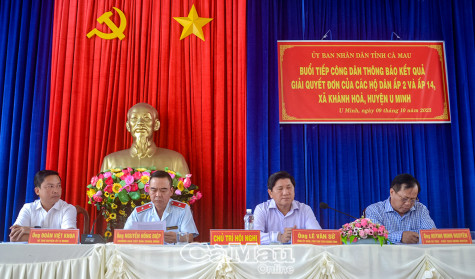 Chiều 9/10, Phó chủ tịch UBND tỉnh Cà Mau Lê Văn Sử chủ trì buổi tiếp công dân thông báo kết quả giải quyết đơn của các hộ dân ấp 2 và 14, xã Khánh Hoà, huyện U Minh. Ông Nguyễn Hồng Điệp, Trưởng ban Tiếp dân Trung ương, đến dự.