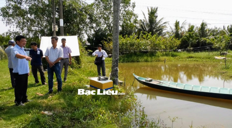 Lãnh đạo huyện Hồng Dân kiểm tra tình hình tôm nuôi trong mùa nắng nóng. Ảnh: A.B