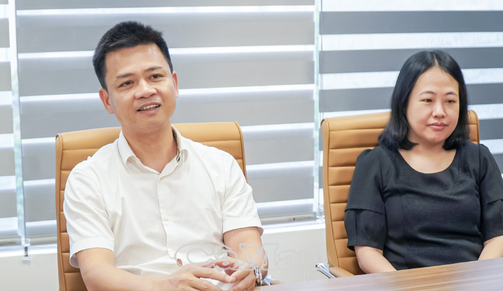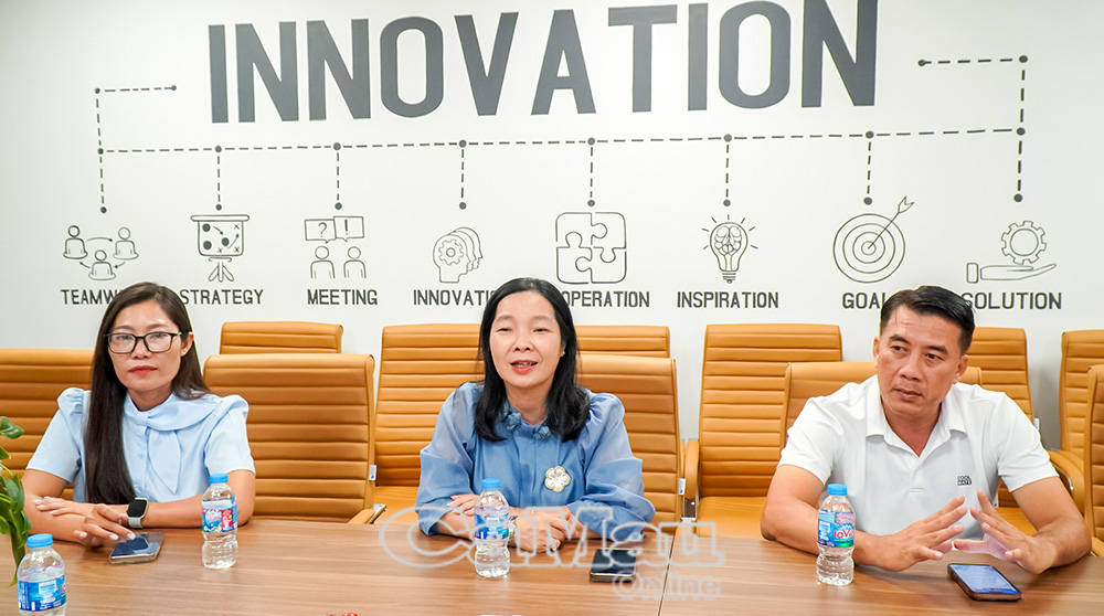Nhà báo Cao Xuân Thu Ngọc (giữa), Phó Giám đốc Báo và phát thanh, truyền hình Cà Mau, trao đổi về định hướng ứng dụng các giải pháp sáng tạo vào thực tiễn sản xuất tại đơn vị.