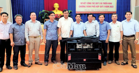 Ông Dương Hoàng Giang, Giám đốc Trung tâm Văn hoá tỉnh (thứ 4 từ phải sang) trao bộ âm thanh tượng trưng cho các huyện, thành phố nhân hội nghị sơ kết quý I-2023, tại huyện Ðầm Dơi.