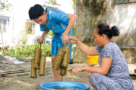 | Bánh tét phải được cột bằng dây lác mới đầy đủ phong vị Tết quê. |