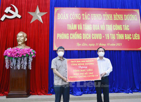 Dịp này, thay mặt lãnh đạo Tỉnh ủy - HĐND - UBND tỉnh Bình Dương, ông Võ Văn Minh trao tặng tỉnh Bạc Liêu nhiều vật tư y tế và kinh phí hỗ trợ tỉnh trong công tác phòng, chống dịch COVID-19. Cụ thể, Bình Dương hỗ trợ Bạc Liêu kinh phí 3 tỷ đồng, 15 máy thở, 100 máy tạo ô xy, 500 nhiệt kế cầm tay...