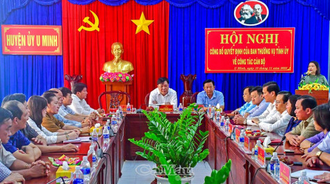 (CMO) Sáng ngày 10/11, Huyện uỷ U Minh tổ chức Hội nghị công bố Quyết định của Ban Thường vụ Tỉnh uỷ về công tác cán bộ. Tham dự có đồng chí Phạm Thành Ngại, Phó bí thư Thường trực Tỉnh ủy; đồng chí Huỳnh Thị Thanh Loan, Uỷ viên Ban Thường vụ Tỉnh ủy, Trưởng ban Tổ chức Tỉnh ủy; đồng chí Hồ Trung Việt, Uỷ viên Ban Thường vụ Tỉnh ủy, Trưởng ban Tuyên giáo Tỉnh ủy.