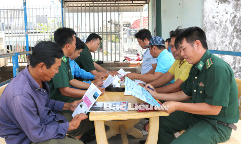 Trạm Kiểm soát Biên phòng phát tờ rơi tuyên truyền pháp luật cho ngư dân. Ảnh: T.H