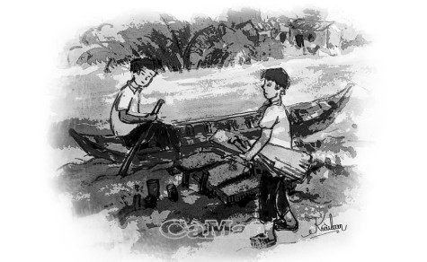 Nghe tôi réo, anh Tư vác “đồ nghề” xuống bến, rồi hai anh em chuyển xuống xuồng. Ðồ nghề mà tôi nói là mấy cây trâm bầu chừng bằng cườm tay, mớ ván còng mới xả, mặt ván còn bám bụi, cây cưa, cây búa, bọc đinh và vài thứ lặt vặt khác. Sắp xếp xong xuôi, anh Tư cầm sào chống sau lái, tôi ngồi mũi bơi đi. Hôm nay là ngày tôi tựu trường.