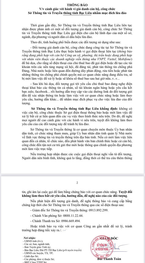Sở Thông tin và Truyền thông (TT-TT) tỉnh Bạc Liêu vừa phát đi thông báo cảnh giác với hành vi giả danh cán bộ, công chức Sở TT-TT tỉnh nhằm mục đích lừa đảo.
