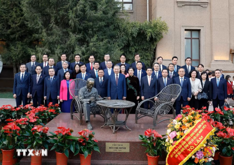Tổng Bí thư, Chủ tịch nước Tô Lâm và Phu nhân cùng các đồng chí lãnh đạo Đảng, Nhà nước chụp ảnh lưu niệm tại bức tượng Chủ tịch Hồ Chí Minh trong khuôn viên Đại sứ quán - Ảnh: TTXVN