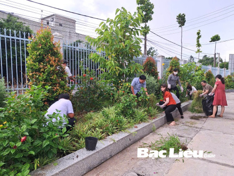 Tổng vệ sinh khu vực trụ sở Đảng ủy - HĐND - UBND - Ủy ban MTTQ Việt Nam Phường 5 (TP. Bạc Liêu). Ảnh: N.Q
