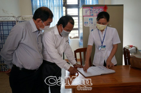 Tiến sĩ Nguyễn Minh Luân (giữa) kiểm tra công tác phòng, chống dịch bệnh và chăm sóc sức khỏe học sinh tại phòng y tế của trường phổ thông Dân tộc Nội trú Cà Mau