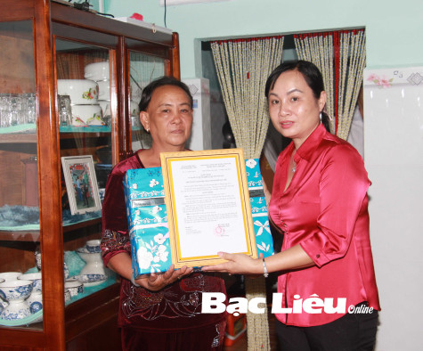 Bà Đỗ Ái Lam - Phó Chủ tịch UBND TP. Bạc Liêu (bên phải) trao quyết định hỗ trợ xây nhà tình nghĩa và quà cho bà Võ Thị Nga (khóm 5, Phường 2).