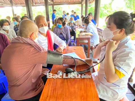 Lực lượng y, bác sĩ Trung tâm Y tế TP. Bạc Liêu khám bệnh và cấp thuốc miễn phí cho đồng bào Khmer xã Vĩnh Trạch Đông.