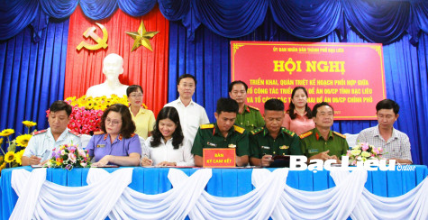Lãnh đạo Công an tỉnh và TP. Bạc Liêu chứng kiến các cơ quan, đơn vị ký cam kết thực hiện Kế hoạch phối hợp triển khai Đề án 06 trên địa bàn thành phố. Ảnh: N.Q