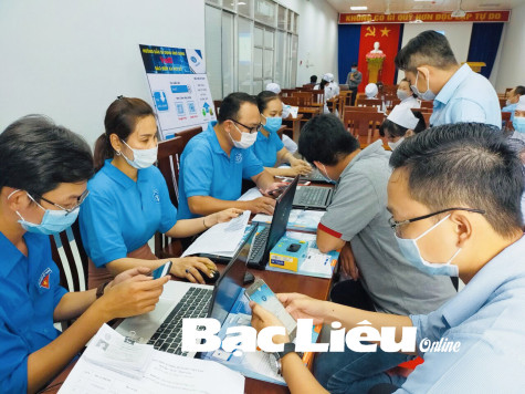 Cán bộ, nhân viên Bảo hiểm xã hội tỉnh hướng dẫn người dân các xã vùng ven của TP. Bạc Liêu tra cứu thông tin bảo hiểm y tế trên điện thoại di động. Ảnh: T.A