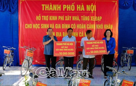 (CMO) Ngày 10/12, Phó Bí thư Thường trực Tỉnh ủy Cà Mau Phạm Bạch Đằng cùng bà Ngô Thị Thanh Hằng, Ủy viên Ban chấp hành Trung ương Đảng, Phó Bí thư Thường trực Thành ủy Hà Nội về huyện Ngọc Hiển trao tặng 2 căn nhà tình nghĩa và 50 xe đạp cho học sinh nghèo trên địa bàn xã Đất Mũi. Tổng kinh phí 165 triệu đồng do Tp.Hà Nội hỗ trợ.