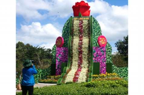 | Du khách chiêm ngưỡng “Thác hoa tươi lớn nhất Việt Nam” với chiều cao 12 m, đường kính 19 m. Thác hoa được gắn kết từ 2.500 giỏ hoa tươi của Làng hoa Sa Đéc, được đặt bên trái tượng đài Bác Hồ trong Công viên Sa Đéc của Tuần lễ Du lịch Đồng Tháp (từ 7-14/1). |