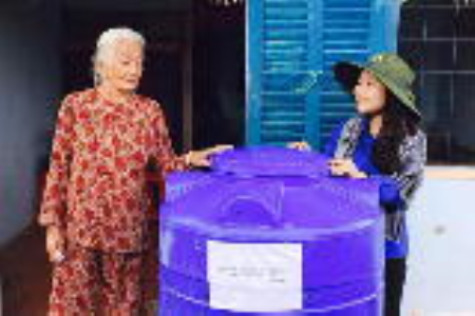 | Sinh viên tình nguyện hè trao tặng bồn chứa nước sạch cho mẹ VNAH. |