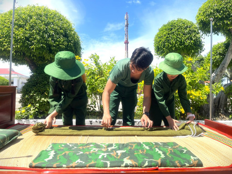 Các đội viên, thiếu nhi học và thực hành gấp chăn nội vụ trong quân đội. Ảnh: Đ.K.C