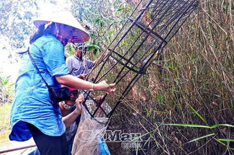 2,5 ha còn lại là đất rừng. Anh Tư Nhiệm đưa chúng tôi đi vào sâu bên trong. Chiếc xuồng áp sát mé kênh, anh Tư ra hiệu bạn ngồi trước dỡ lọp cá. Kéo lên tới mặt nước, anh chàng Huy cận reo vui: “Có cá anh ơi. Lóc, rô, trê đủ thứ. Thích quá!”. Được anh Tư hướng dẫn mở lọp, đổ cá ra, Huy hứng khởi: “Hồi đó giờ toàn biết ăn không à. Bữa nay được tự tay bắt cá kiểu này, mới thấy người dân mình kiếm cá bán đâu có dễ”. Xuồng tiếp tục ghé bụi năn bộp dỡ trúm lươn. Bận này, Huy lắc đầu. Cô con gái chị Lan nhăn mặt, nhưng làm gan dỡ thử. Trút trúm, con lươn rớt ra, cô nàng thích thú.