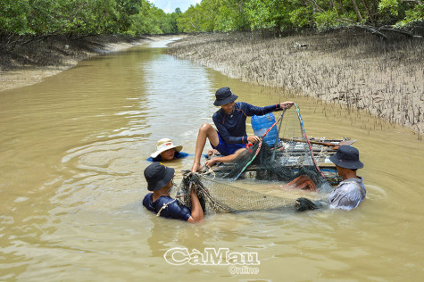 | Người dân xóm đảo thường vào rừng kiếm sống. (Trong ảnh: Đánh bắt cá ở các con kênh trong rừng.) |