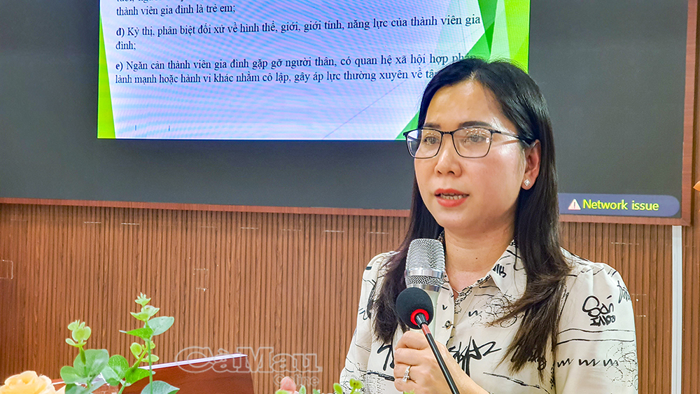 Bà Lê Thị Ngọc Linh, Phó Chủ tịch Uỷ ban MTTQ Việt Nam tỉnh Cà Mau, Chủ tịch Hội LHPN tỉnh, chia sẻ chuyên đề về Luật Phòng, chống bạo lực gia đình, xâm hại trẻ em và Luật An ninh mạng.