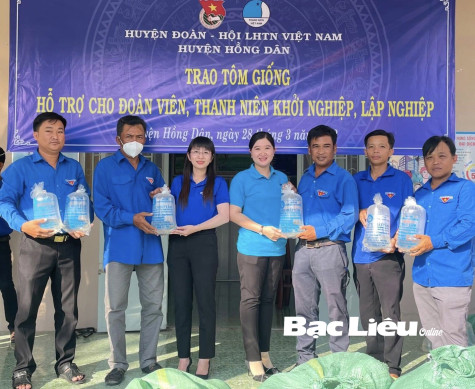 (BL-HL) Ngày 28/3, Huyện đoàn và Hội LHTN Việt Nam huyện Hồng Dân tổ chức trao 1 triệu con tôm giống cho 35 đoàn viên - thanh niên trên địa bàn huyện khởi nghiệp, lập nghiệp với tổng trị giá 179 triệu đồng (ảnh).