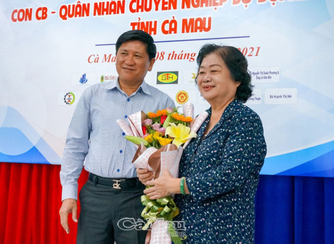 Phó chủ tịch UBND tỉnh Cà Mau Lê Văn Sử tặng hoa cảm ơn bà Trương Mỹ Hoa. |