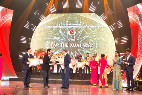 Đồng chí Hàn Ái Tiến - Tổng Biên tập Báo Bạc Liêu nhận giải tập thể xuất sắc cho đơn vị Báo Bạc Liêu. Ảnh: A.N