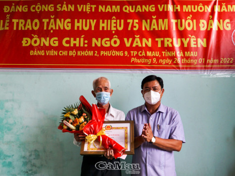 | Bí thư Tỉnh uỷ Cà Mau Nguyễn Tiến Hải trao Huy hiệu 75 năm tuổi Đảng cho đảng viên Ngô Văn Truyền. |