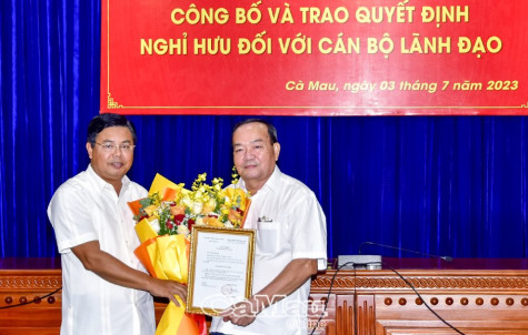 | Uỷ viên BCH Trung ương Đảng, Bí thư Tỉnh uỷ, Chủ tịch HĐND tỉnh Cà Mau Nguyễn Tiến Hải (bìa trái) trao quyết định của Ban Bí thư Trung ương Đảng nghỉ hưu cho đồng chí Phạm Bạch Đằng, nguyên Phó bí thư Thường trực Tỉnh uỷ. |