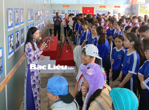 Các em học sinh nghe thuyết minh về chuyên đề “Quân đội nhân dân Việt Nam 80 năm xây dựng, chiến đấu và trưởng thành”.