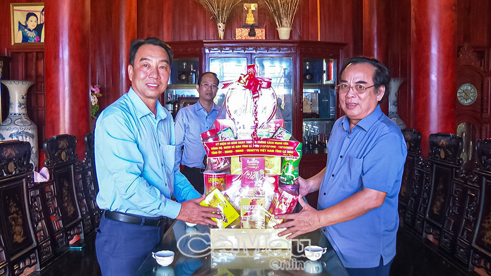 Chủ tịch UBND tỉnh Lữ Quang Ngời thay mặt Tỉnh uỷ, HĐND, UBND và Uỷ ban MTTQ Việt Nam tỉnh Cà Mau tặng quà đồng chí Dương Thành Trung nhân kỷ niệm 85 năm Khởi nghĩa Hòn Khoai và ngày Truyền thống cách mạng của Đảng bộ, quân và dân tỉnh Cà Mau.