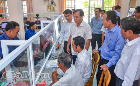 Trước đó, Phó Bí thư Thường trực Tỉnh uỷ Huỳnh Quốc Việt cùng đoàn công tác đã đến thăm, tìm hiểu các mô hình sản xuất, kinh doanh hiệu quả trên địa bàn xã Hồng Dân; kiểm tra tình hình hoạt động của Trung tâm Phục vụ hành chính công xã. (Trong ảnh: Đồng chí Huỳnh Quốc Việt gặp gỡ, thăm hỏi người dân đến giao dịch tại Trung tâm Phục vụ hành chính công xã).