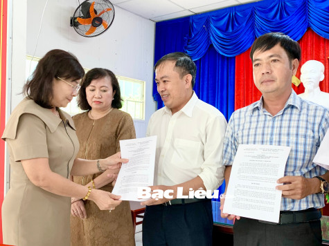 Bà Lâm Thị Sang - Giám đốc Sở GD-ĐT trao quyết định làm Trưởng điểm thi cho cán bộ được giao nhiệm vụ.