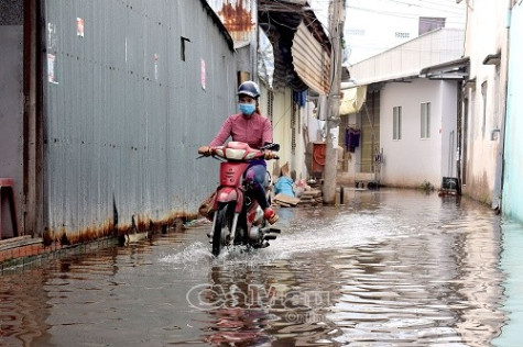 | Việc đi lại của người dân gặp khó khi một số tuyến đường nội ô thị trấn Năm Căn bị ngập. |