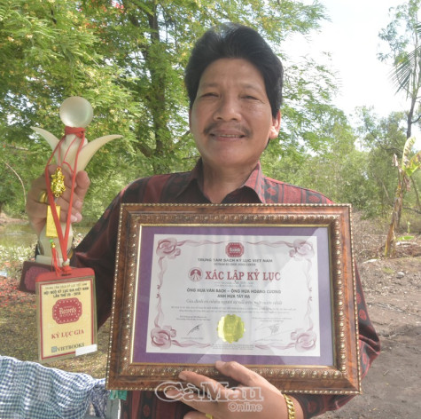 | Ông Hứa Hoàng Cương khoe chứng nhận xác lập kỷ lục và biểu tượng lưu niệm. |