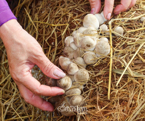 Ðối với vợ chồng anh Võ Văn Huỳnh (ấp Cơi 5A, xã Khánh Bình Tây), đây là vụ nấm rơm đầu tiên anh làm thử, nhưng không ngờ lại quá trúng. Với 5 công đất ruộng, anh chị làm rẫy quanh năm. Thời điểm này vào mùa hạn nên anh chị tận dụng thời gian và đất trống quanh nhà, lên giồng trồng nấm rơm với diện tích khoảng 1.000 m2, anh mua 420 cuộn rơm và 720 bọc meo để trồng nấm.