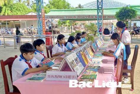 Ngoài ra, đơn vị đang tổ chức trưng bày sách chuyên đề Hồ Chí Minh với giáo dục tại Trường THCS Nguyễn Minh Nhựt (TT. Châu Hưng, huyện Vĩnh Lợi). Với 800 bản sách, hoạt động mang đến cho các em học sinh các sách của Bác về giáo dục, tình cảm của Chủ tịch Hồ Chí Minh với các em thiếu nhi, sách về Đường mòn Hồ Chí Minh; các mô hình sách nghệ thuật như: nhà sàn Bác Hồ, Bến Nhà Rồng… - (ảnh).