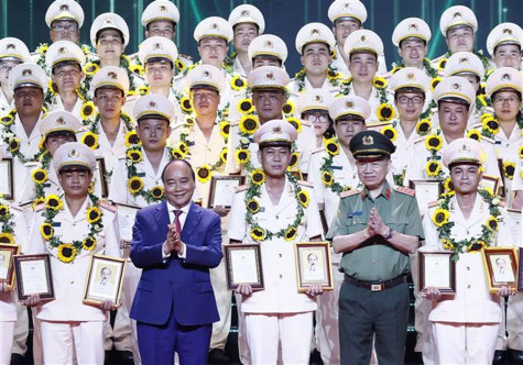Trung tá Ngô Minh Chiến (hàng đầu, thứ 3 từ trái sang) nhận tuyên dương do Chủ tịch nước và Bộ trưởng Bộ Công an trao tặng. Ảnh: T.L