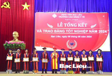 Sáng 8/9, Trường cao đẳng Y tế Bạc Liêu tổ chức Lễ tổng kết và trao bằng tốt nghiệp năm 2024 cho tân khoa các hệ cao đẳng chính quy, liên thông, vừa làm vừa học thuộc các khối ngành Điều dưỡng, Dược và Hộ sinh. Theo đó, qua 3 đợt xét tốt nghiệp năm 2024, có tổng số 394 sinh viên (kể cả sinh viên xét tốt nghiệp trễ) tham gia.