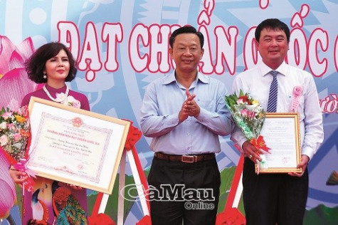 Ông Hồ Trung Việt, Trưởng Ban Tuyên giáo Tỉnh ủy Cà Mau trao quyết định và bằng công nhận trường Mầm non Búp Sen Hồng đạt chuẩn quốc gia.