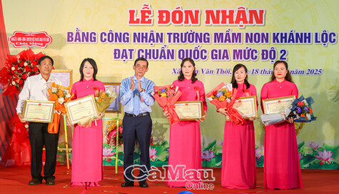 Đồng chí Nguyễn Thế Châu, Bí thư Đảng uỷ, Chủ tịch HĐND xã, và đồng chí Phan Kim Bía, Chủ tịch UBND xã Trần Văn Thời trao bằng khen cho các tập thể và cá nhân có thành tích tiêu biểu trong quá trình xây dựng Trường Mầm non Khánh Lộc đạt chuẩn Quốc gia mức độ 2.