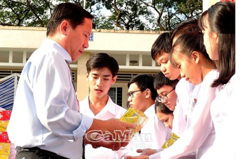 Thầy Trương Minh Hoàng, Hiệu trưởng trường THPT Cà Mau trao thưởng cho học sinh giỏi của trường.