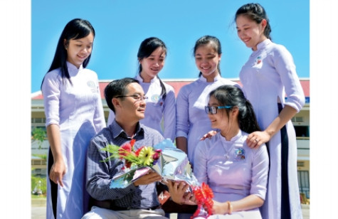 Các em học sinh Trường THPT Thới Bình chúc mừng thầy Võ Văn Thử, Hiệu trưởng nhà trường, nhân ngày Nhà giáo Việt Nam 20/11. Ảnh: KHÁNH PHƯƠNG |