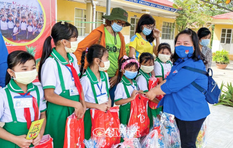 Cô Võ Tuyết Ngân đồng hành cùng hoạt động Mùa xuân cho em được tổ chức tại Trường Tiểu học Ðất Mũi, huyện Ngọc Hiển tháng 2/2021. |