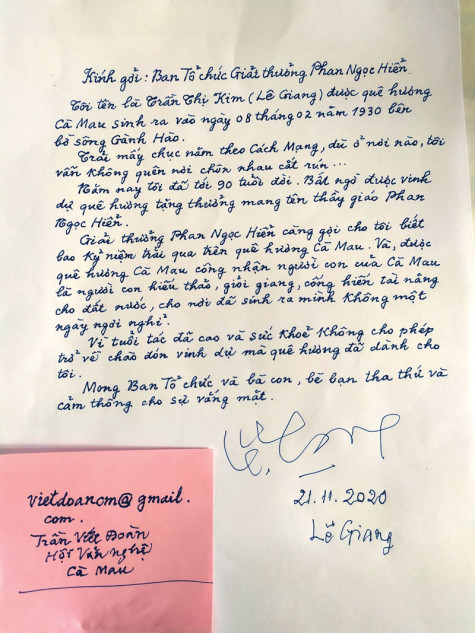 | Bức thư của Nhà thơ Lê Giang gửi Ban tổ chức Giải thưởng Văn học - Nghệ thuật Phan Ngọc Hiển. Ảnh: VIỆT ĐOÀN |