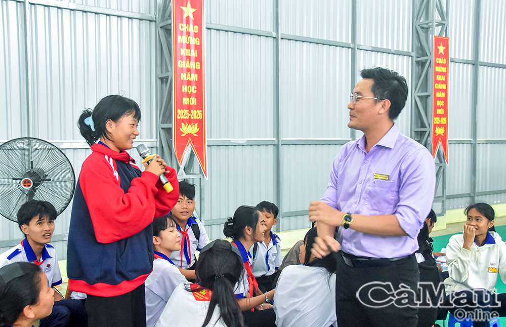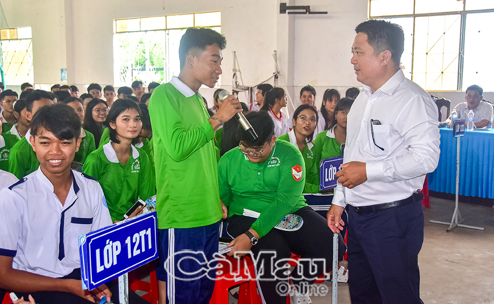 Học sinh THCS Hưng Hội đặt câu hỏi tương tác với đại diện Công ty ICO Group - Chi nhánh Cà Mau, xoay quanh du học nghề.