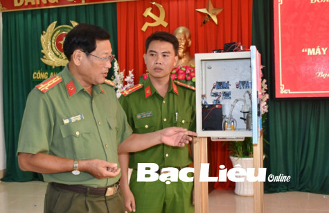 Đại tá Trần Phong - Phó Giám đốc Công an tỉnh kiểm tra nguyên lý hoạt động của máy rửa tay sát khuẩn tự động do Chi đoàn Kỹ thuật hình sự nghiên cứu, sáng tạo.