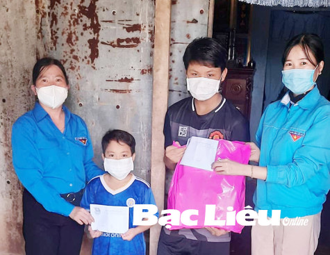 Bí thư Huyện đoàn Đông Hải - Huỳnh Hồng Sa (bìa trái) tặng quà cho em nuôi của Đoàn.