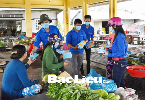 Đoàn viên - thanh niên huyện Phước Long tặng khẩu trang, phát tờ rơi tuyên truyền phòng, chống dịch COVID-19 cho người dân. Ảnh: H.T