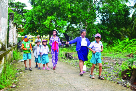 | Trong tiếng chim hót gọi nắng, các em vui bước tới trường. Ảnh: Nhật Minh |
